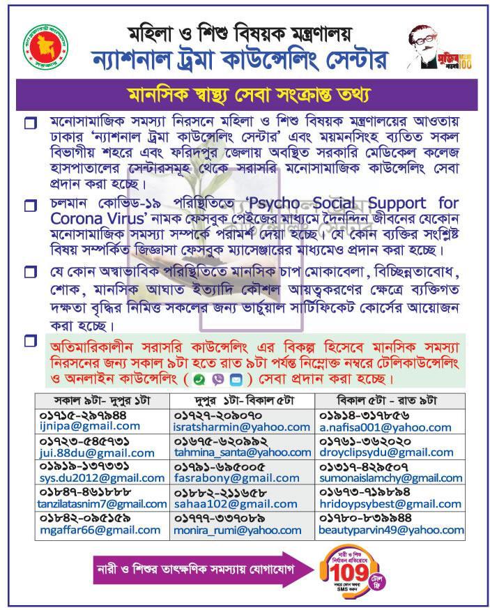 নির্যাতনের শিকার নারী ও শিশুদের জন্য মনোসামাজিক কাউন্সেলিং সহায়তাকে জোরদার করার জন্য ঢাকায় ন্যাশনাল ট্রমা সেন্টার এবং ঢাকা, চটগ্রাম,রাজশাহী,সিলেট,খুলনা,বরিশাল,রংপুর,ফরিদপুর মেডিকেল কলেজ হাসপাতালে রিজিওনাল ট্রমা সেন্টার স্থাপন করা হয়েছে। এই সেন্টার হতে সকল ধরনের নির্যাতনের শিকার নারী ও শিশুদের মনোসামাজিক কাউন্সেলিং সহায়তা প্রদান করা হয়ে থাকে।